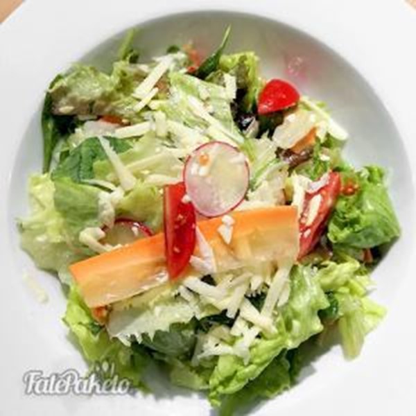 Με ρόκα, μαρούλι, ντοματίνια, καρότο, ραπανάκι, κεφαλοτύρι & dressing λαδολέμονο με μουστάρδα.